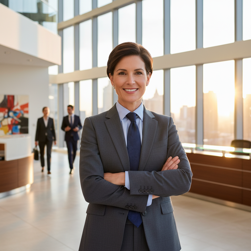 professional businesswoman smiling confidently modern office natural lighting photorealistic